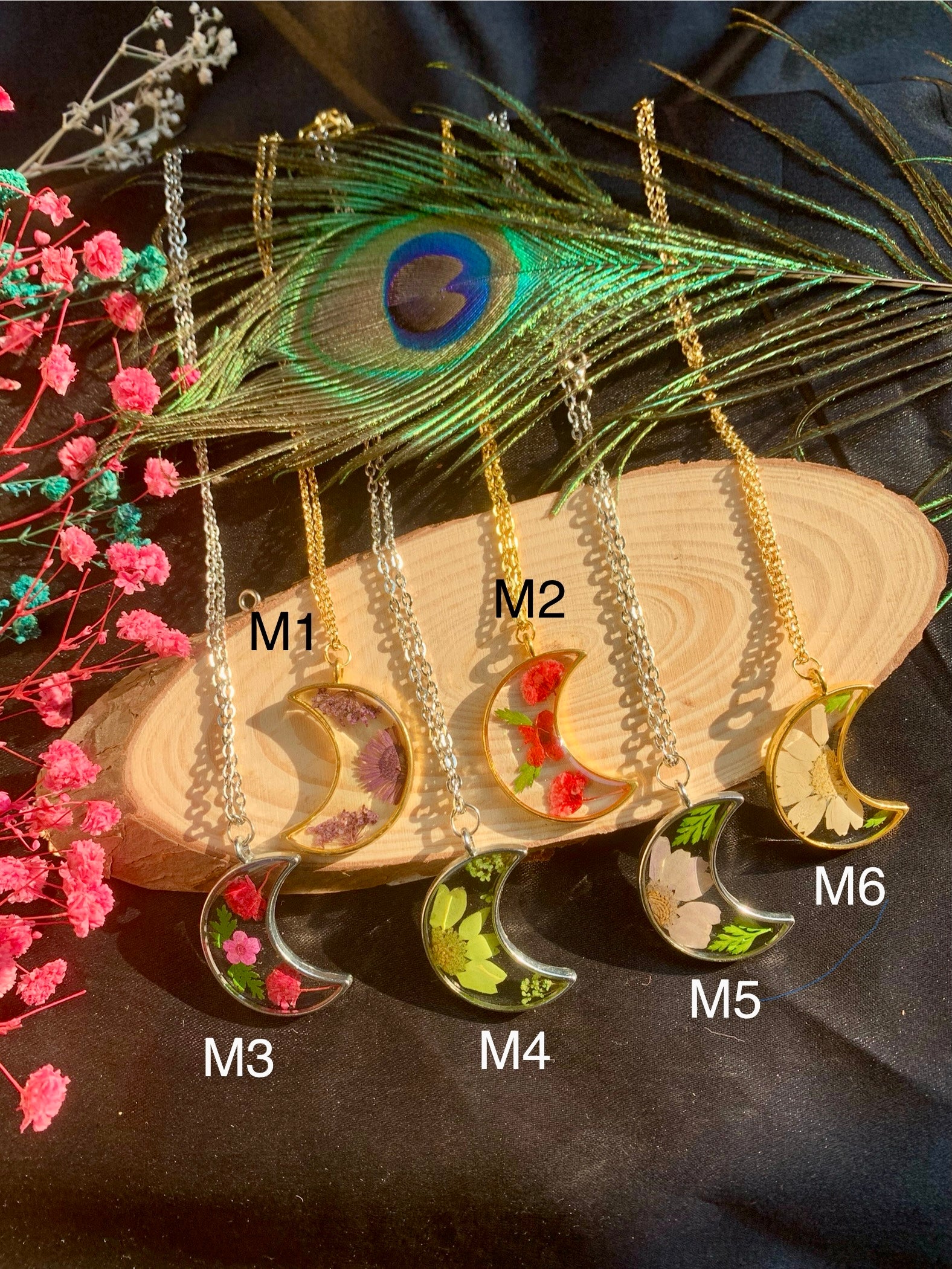 - Celestial Crescent Design: The unique crescent shape beautifully frames the real flowers, including daisy, baby's breath, plum blossom, and aster, making each pendant a one-of-a-kind treasure.