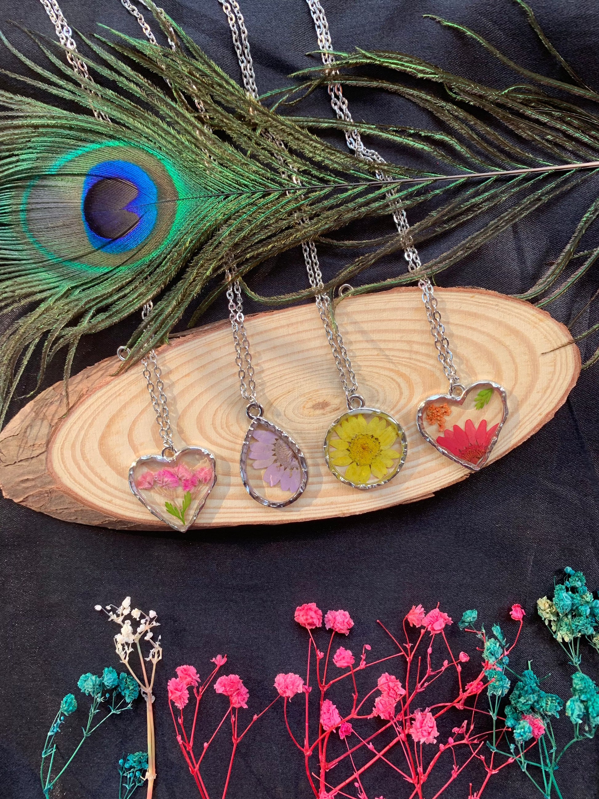 "Each piece is uniquely handcrafted with real flowers, making every jewelry item one of a kind. Slight variations in color and design may occur, adding to its natural beauty."