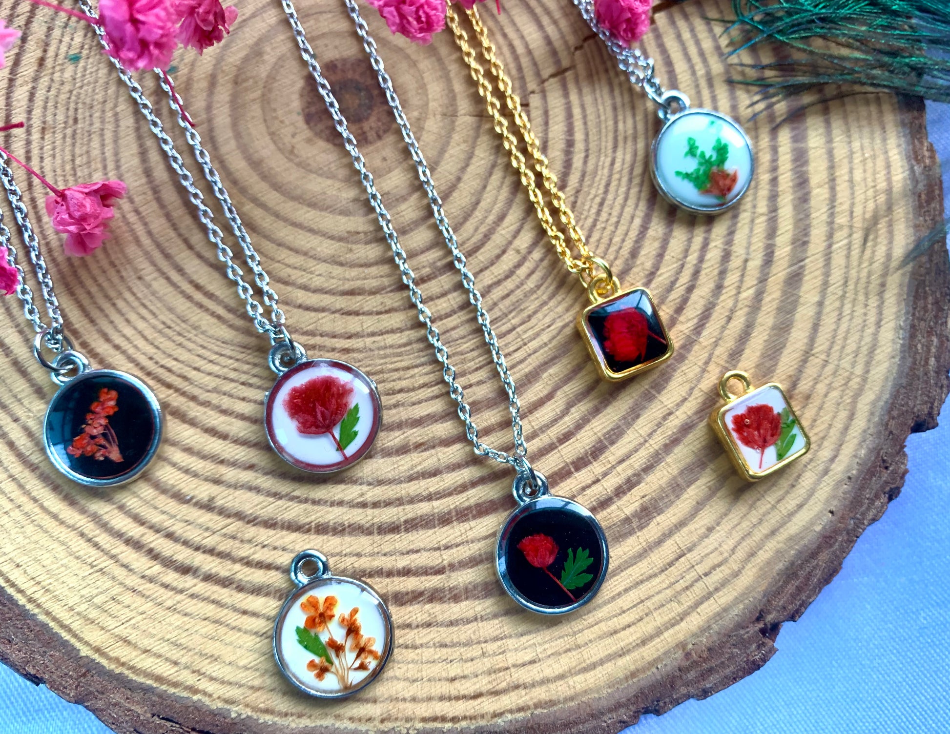 - Distinctive Red Floral Design: Every piece highlights real red flowers, including the enchanting plum blossom and intricate Queen Anne's lace, making each jewelry item a one-of-a-kind treasure.