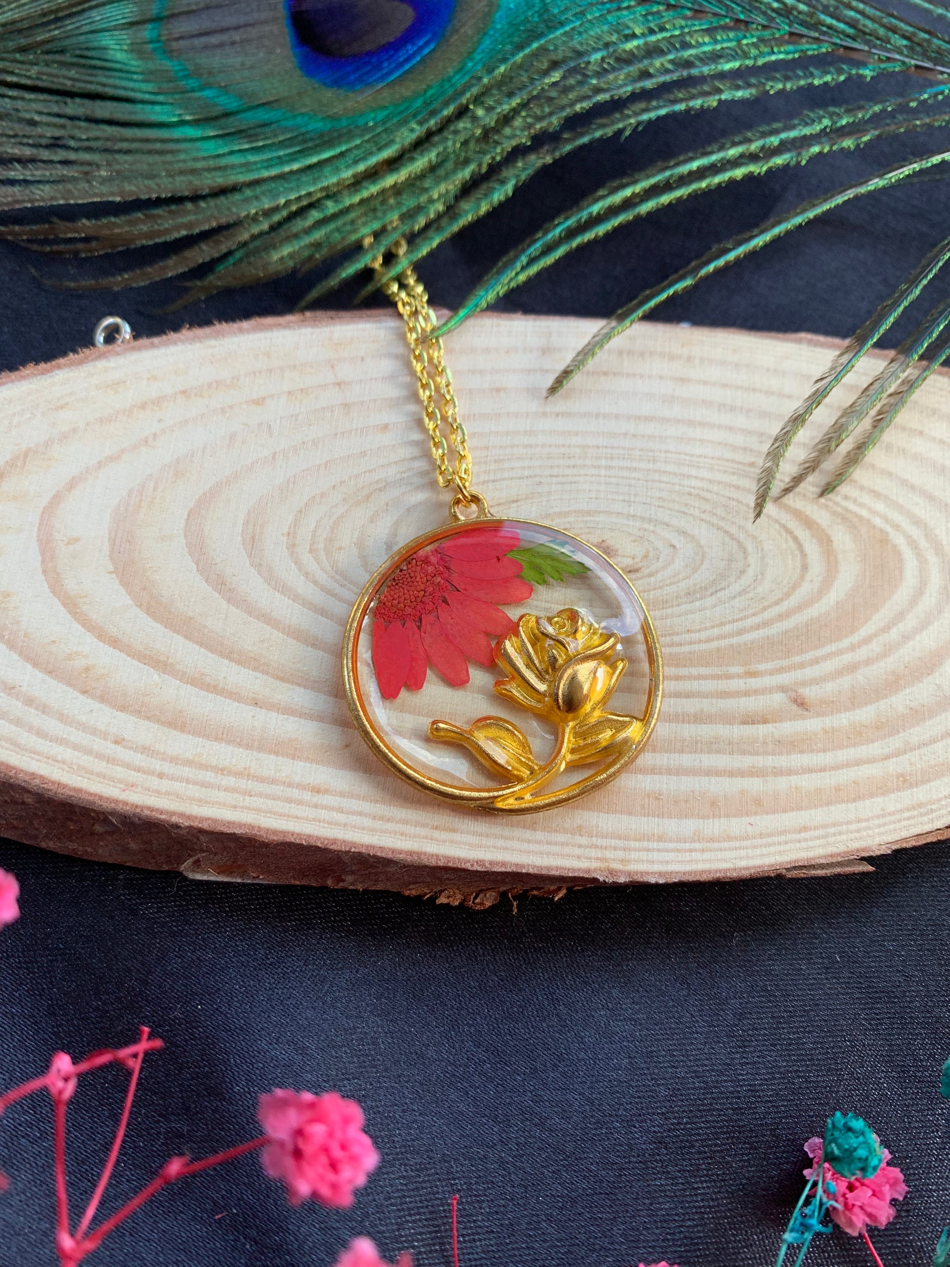 Embrace the vibrant elegance of our Radiant Red Daisy Pendant. This striking piece features a real Red Daisy flower preserved in clear resin, set within an exquisitely designed gold bezel. Hanging from an 18-inch chain, this pendant captures the vivid beauty of nature, adding a touch of sophistication to any ensemble.