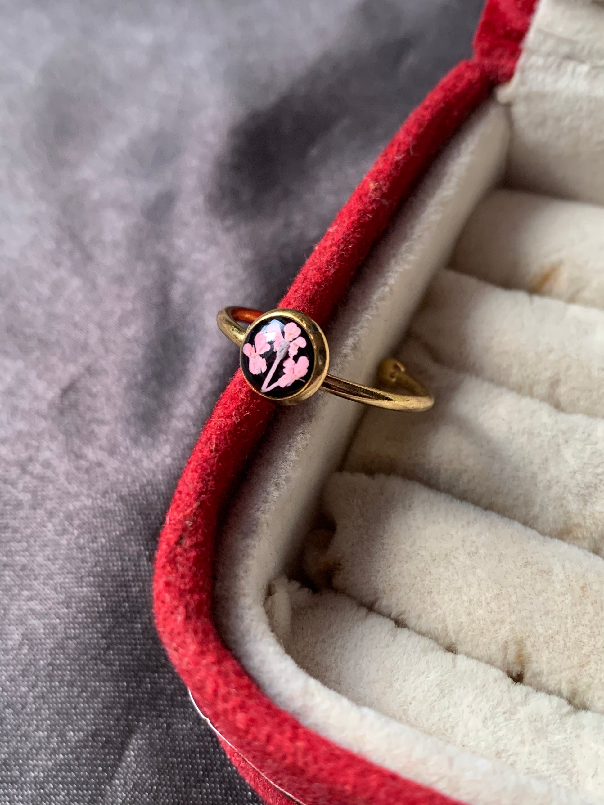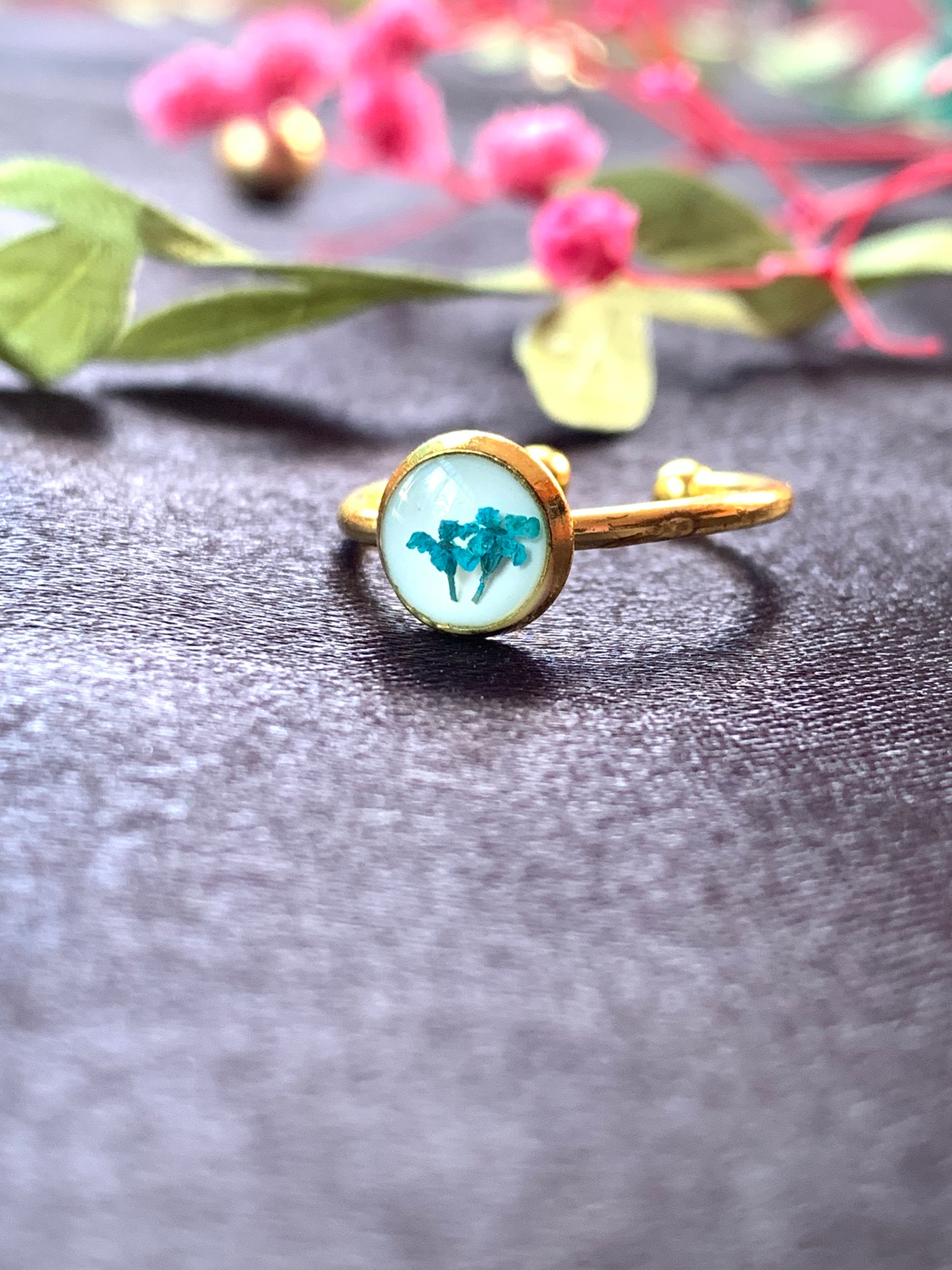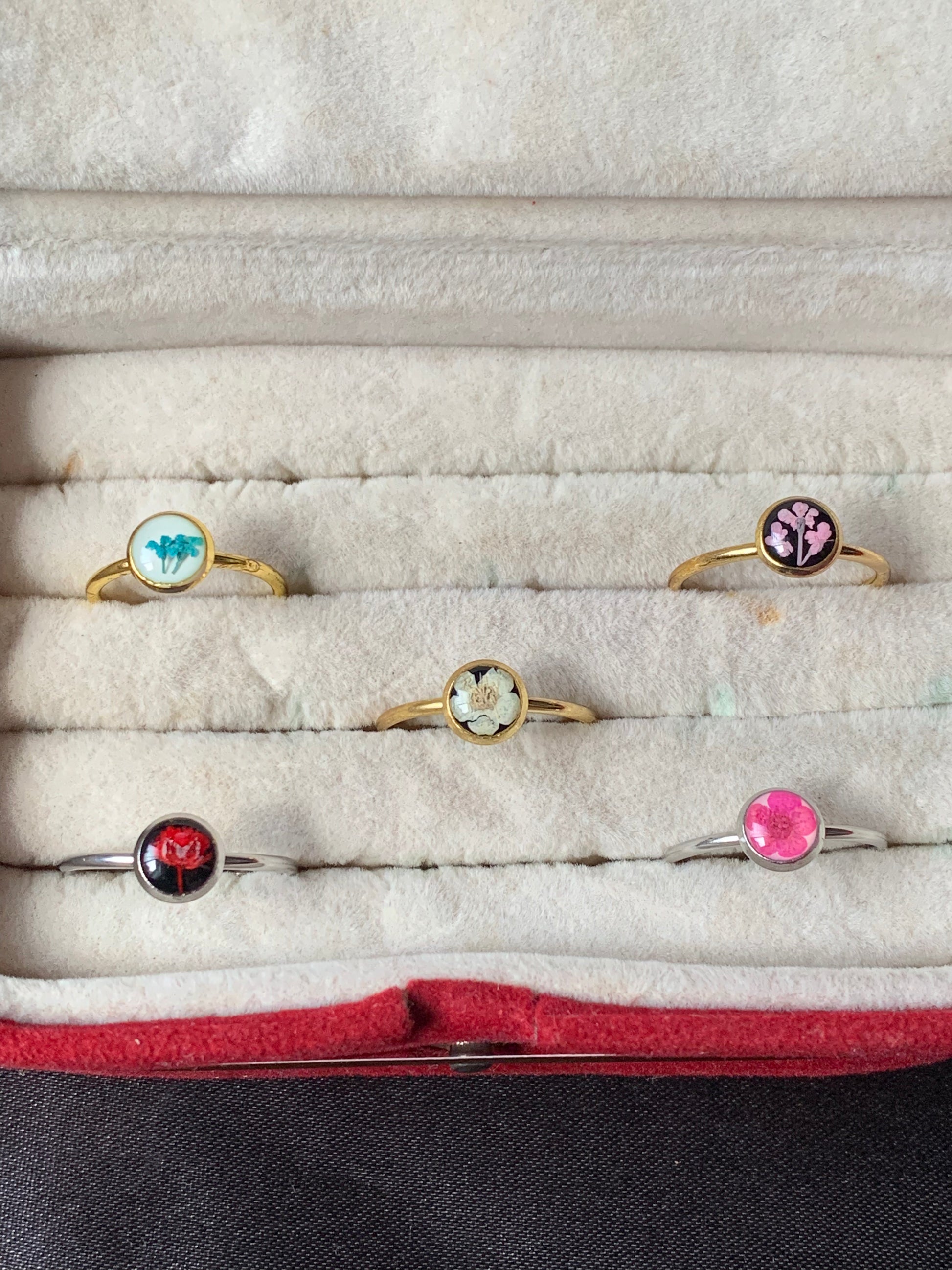 Embrace timeless elegance with our Eternal Floral Ring. This adjustable stainless steel ring, available in both silver and gold finishes, features an 8 mm bezel encasing preserved Plum Blossom, Baby's Breath, and Queen Anne's Lace flowers. The delicate floral arrangement brings a touch of natural beauty and sophistication to this versatile and stylish piece.