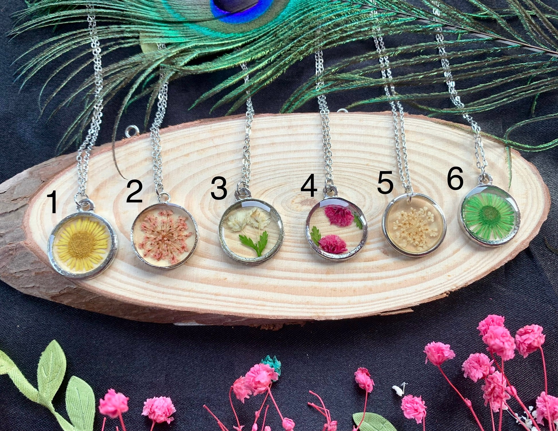 Embrace the delicate beauty of nature with our Tranquil Silver Pendant. This stunning piece features real Queen Anne's Lace, Aster, and Baby's Breath flowers preserved in clear resin, elegantly framed by a 2 cm silver-colored bezel. Hanging from an 18-inch chain, this pendant perfectly combines natural charm with timeless elegance.