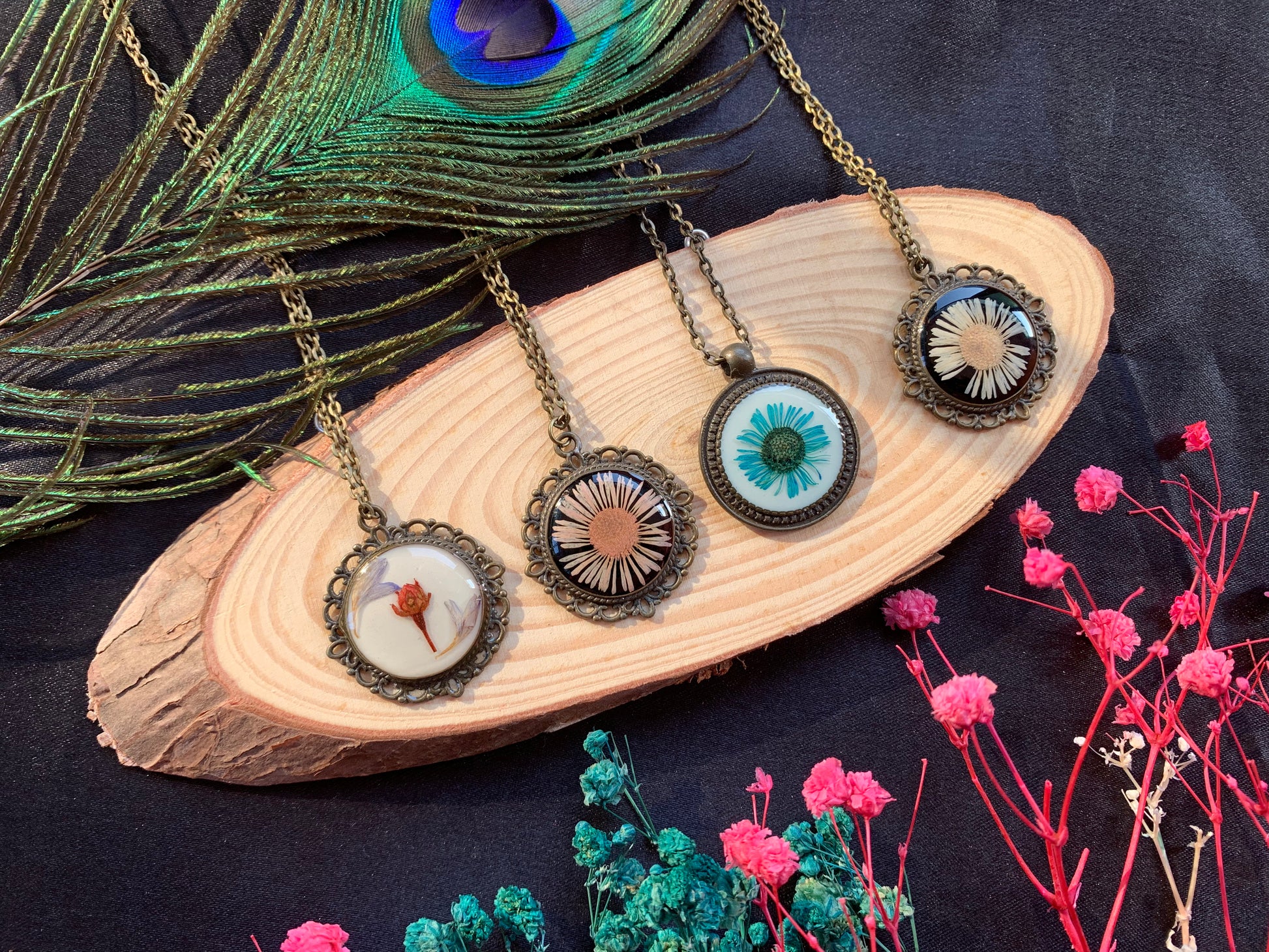 Step into the timeless charm of our Vintage Elegance Pendant. This exquisite piece features real Aster & Rose Bud flowers preserved in resin, encapsulated within a vintage-inspired silver bezel. Hanging from an 18-inch chain, this pendant beautifully combines the elegance of vintage design with the natural beauty of delicate flowers.