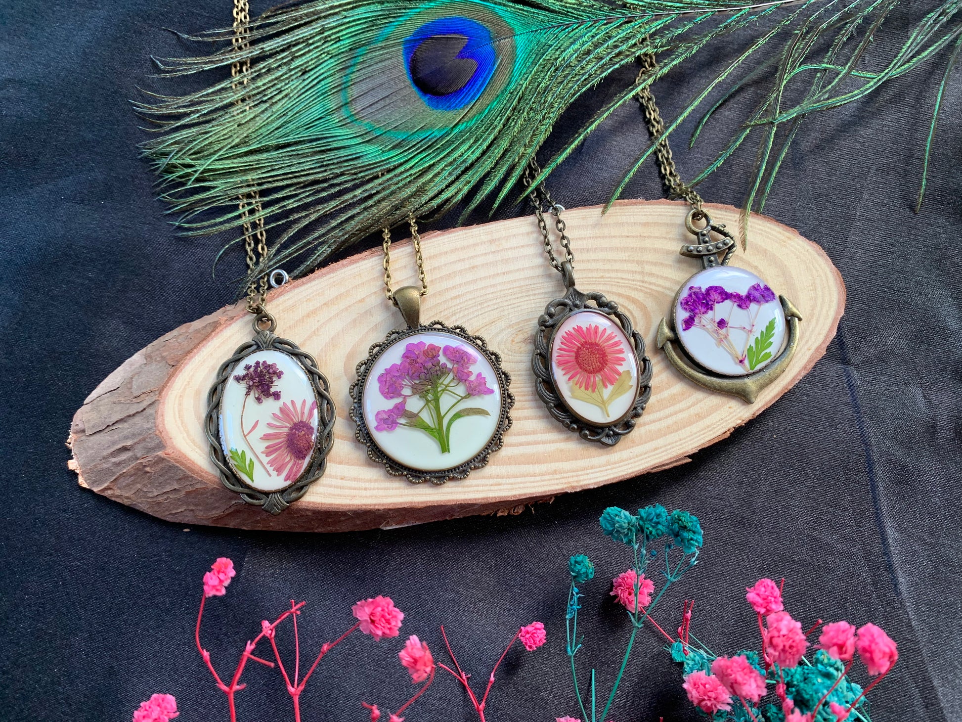 "Each piece is uniquely handcrafted with real flowers, making every jewelry item one of a kind. Slight variations in color and design may occur, adding to its natural beauty."