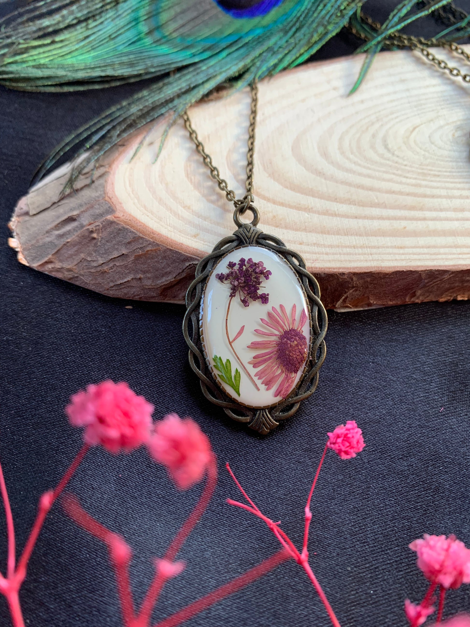 Discover timeless elegance with our Vintage Violet Dreams Pendant. This exquisite piece features real Aster, Baby's Breath, and Alyssum flowers preserved in clear resin, set within a beautifully crafted vintage-style silver bezel. Hanging from an 18-inch chain, this pendant combines the delicate beauty of nature with classic vintage charm.